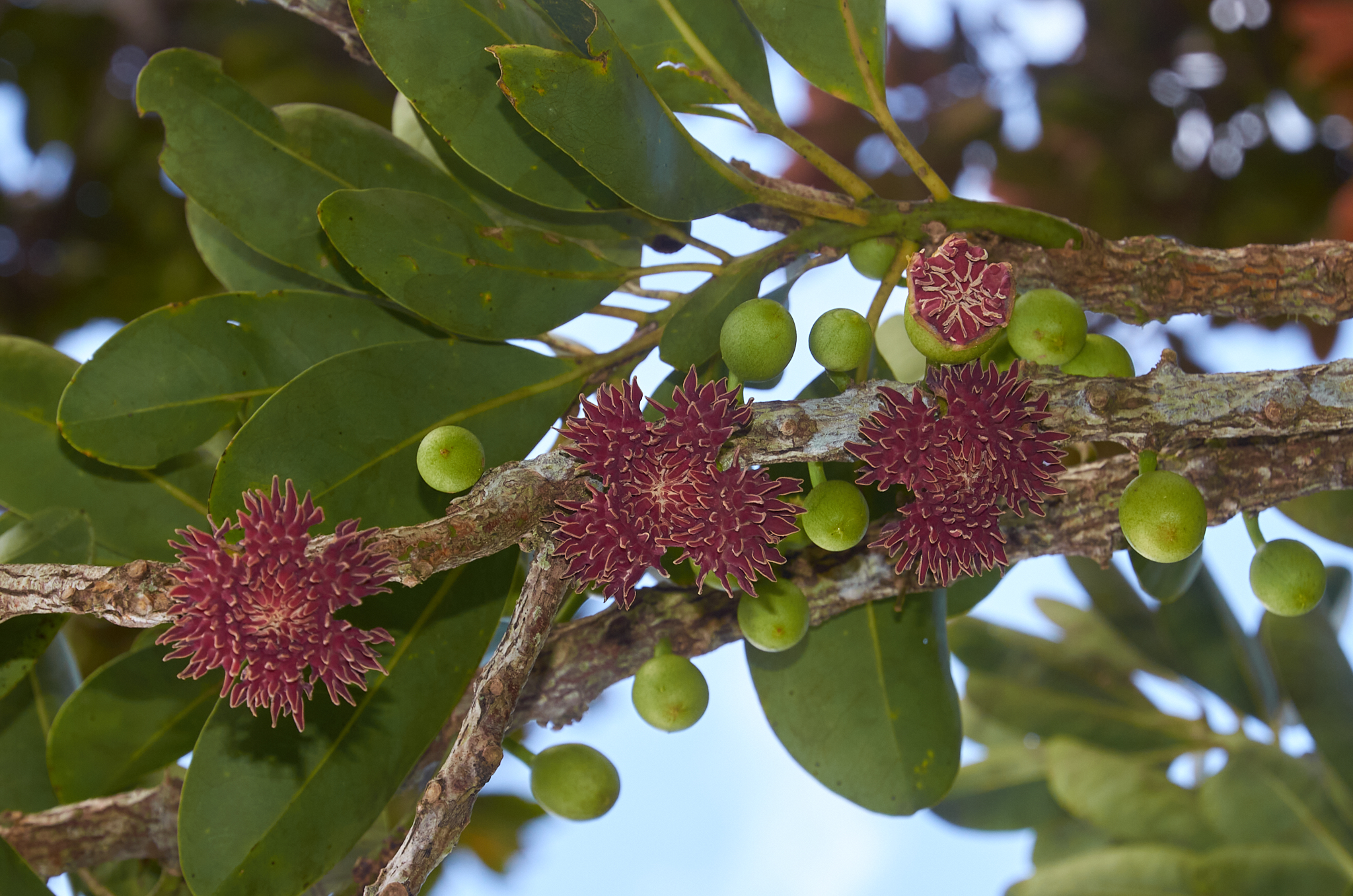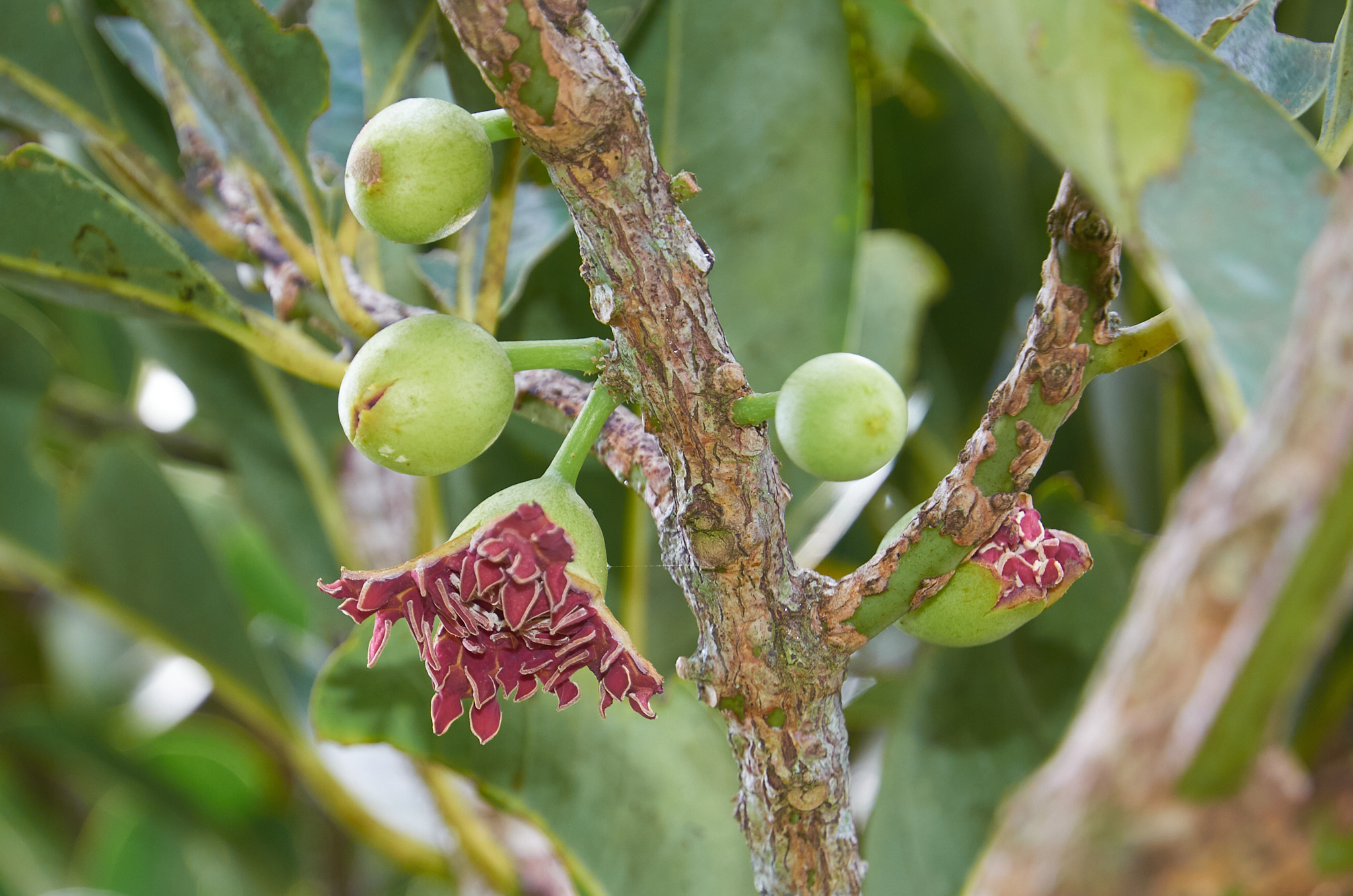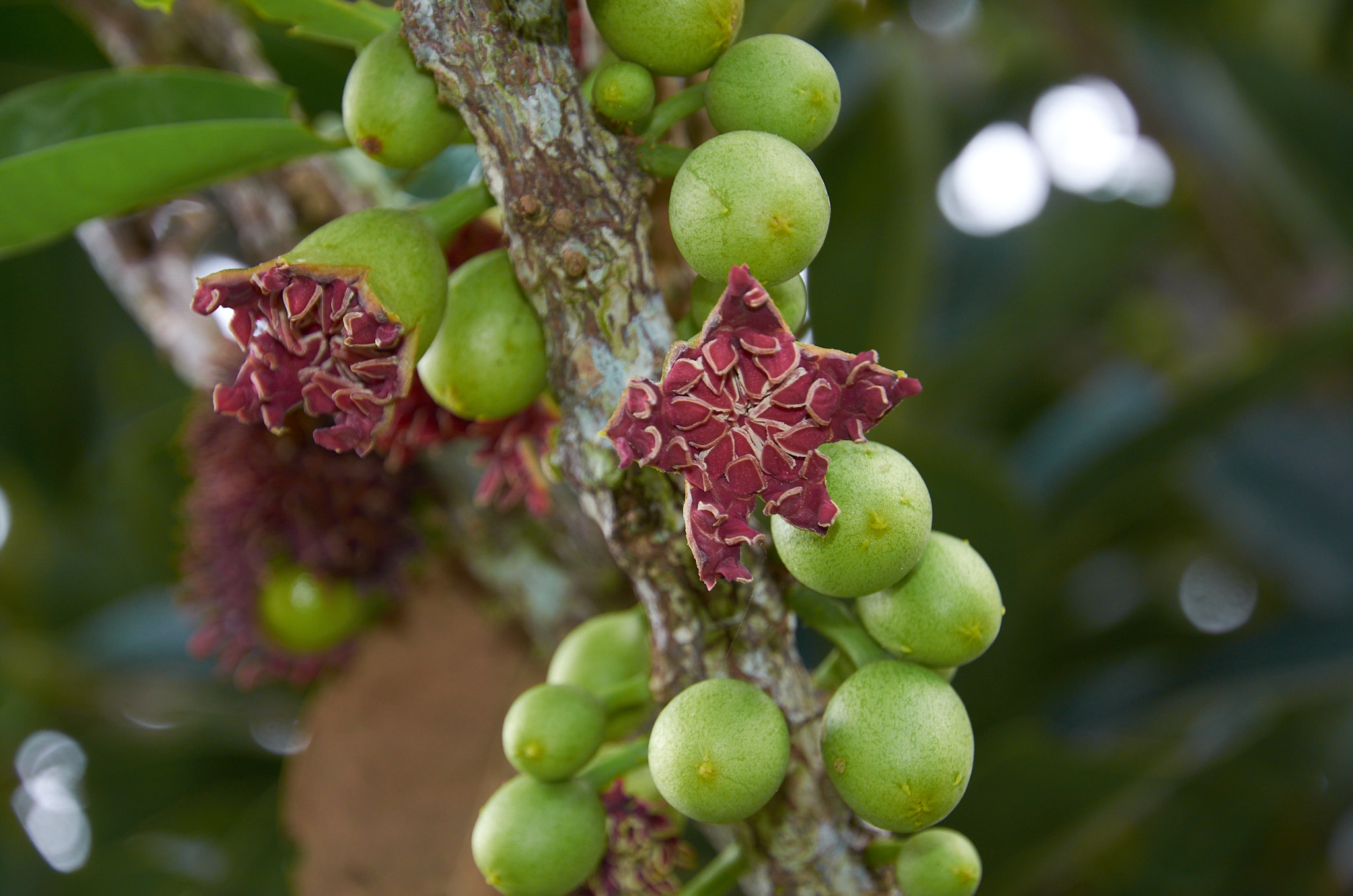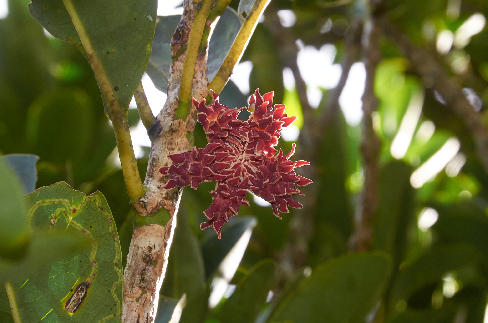 Commentaires : Arbre (jusqu’à 15 m de hauteur) à feuilles entières, opposées ou presque, pétiolées, à limbe assez épais. La plante est cauliflore ; les fleurs sont insérées sur les axes. Les boutons sont ovoïdes et lisse. La paroi des feurs mâles se fend jusqu’à la base en 4 ou 5 lobes, exposant les étamines rouge à pourpre. La paroi des fleurs femelles se fend peu et devient précocement liégeuse.