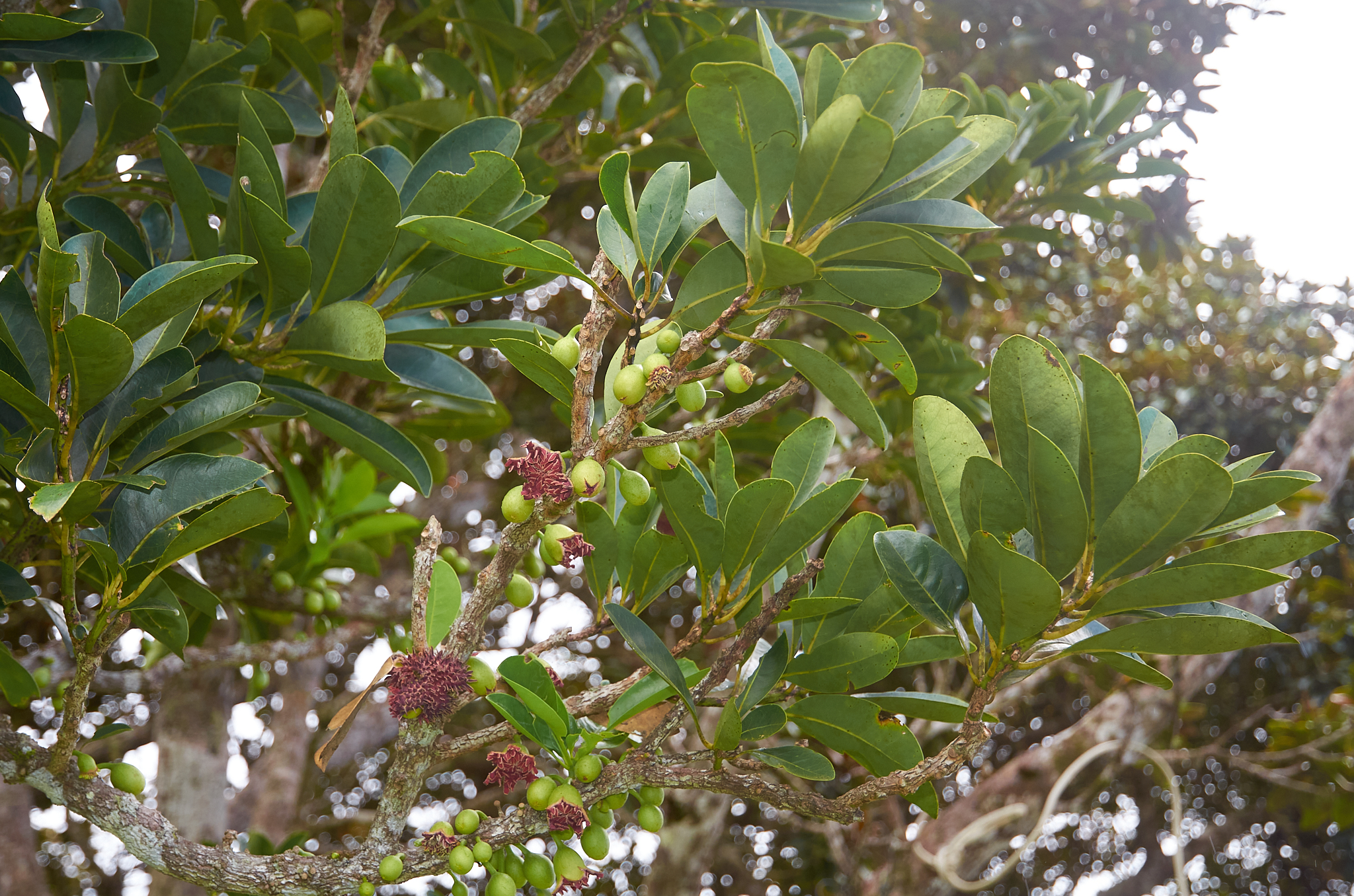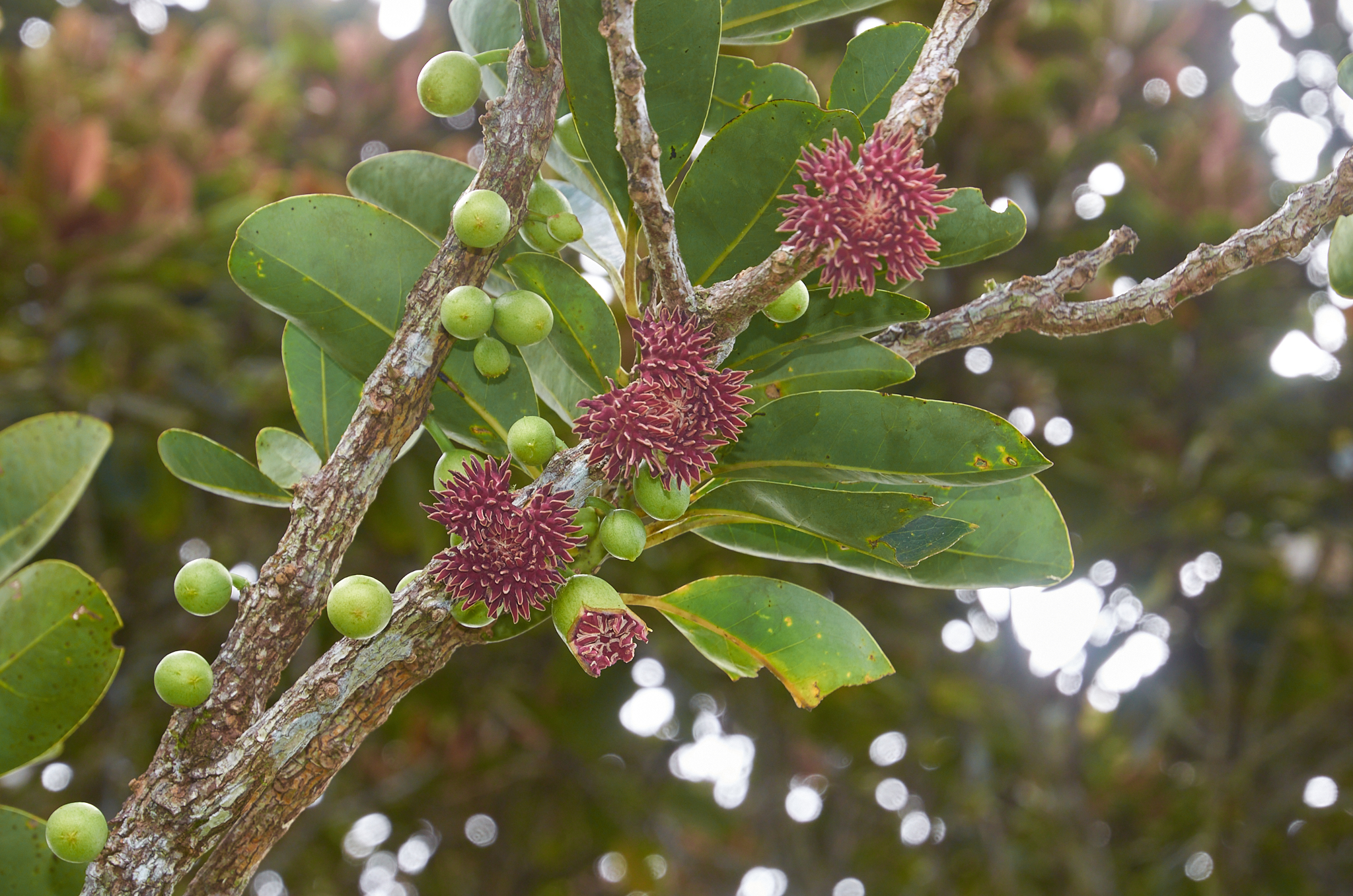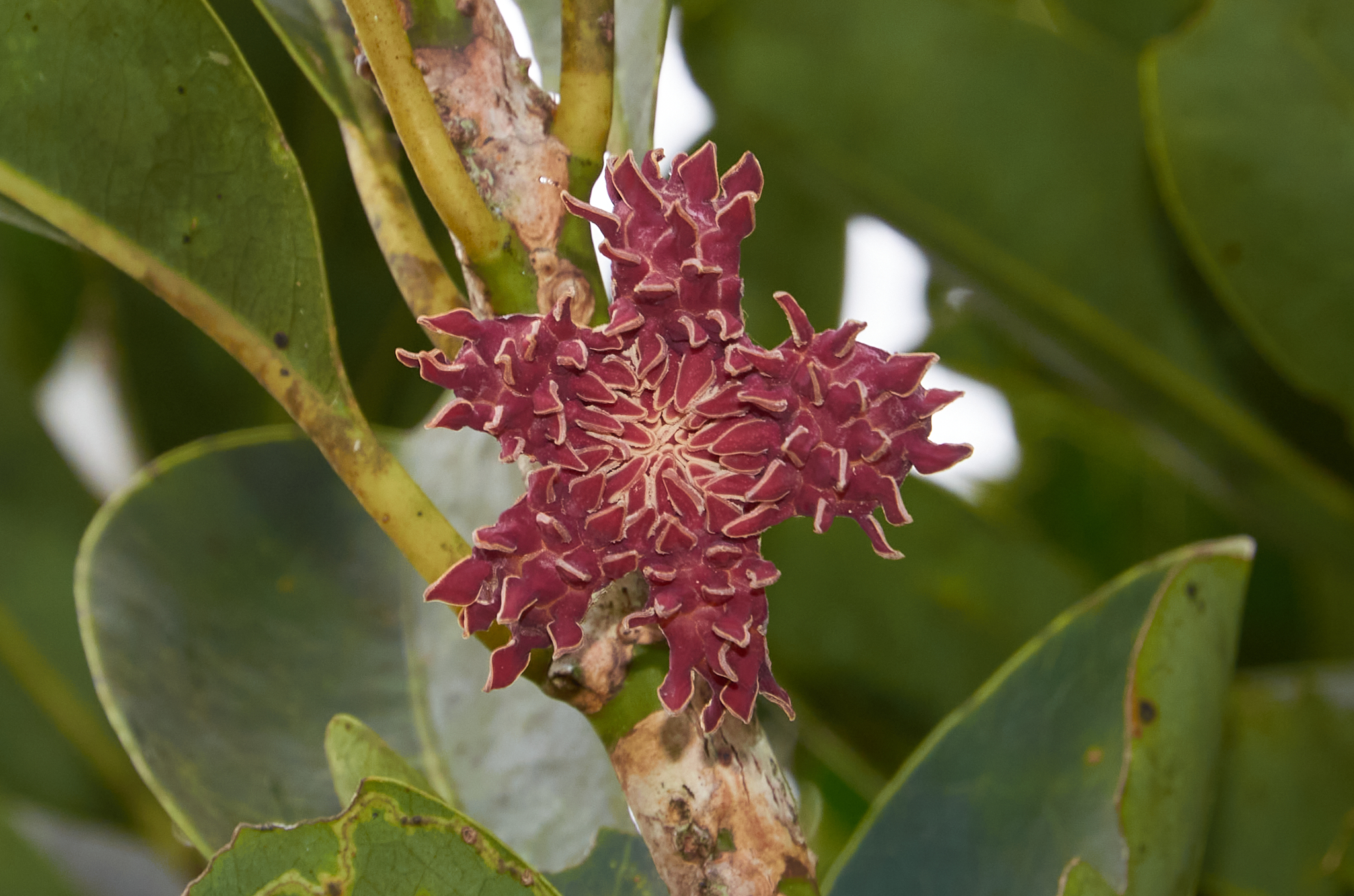 Commentaires : Arbre (jusqu’à 15 m de hauteur) à feuilles entières, opposées ou presque, pétiolées, à limbe assez épais. La plante est cauliflore ; les fleurs sont insérées sur les axes. Les boutons sont ovoïdes et lisse. La paroi des feurs mâles se fend jusqu’à la base en 4 ou 5 lobes, exposant les étamines rouge à pourpre. La paroi des fleurs femelles se fend peu et devient précocement liégeuse.