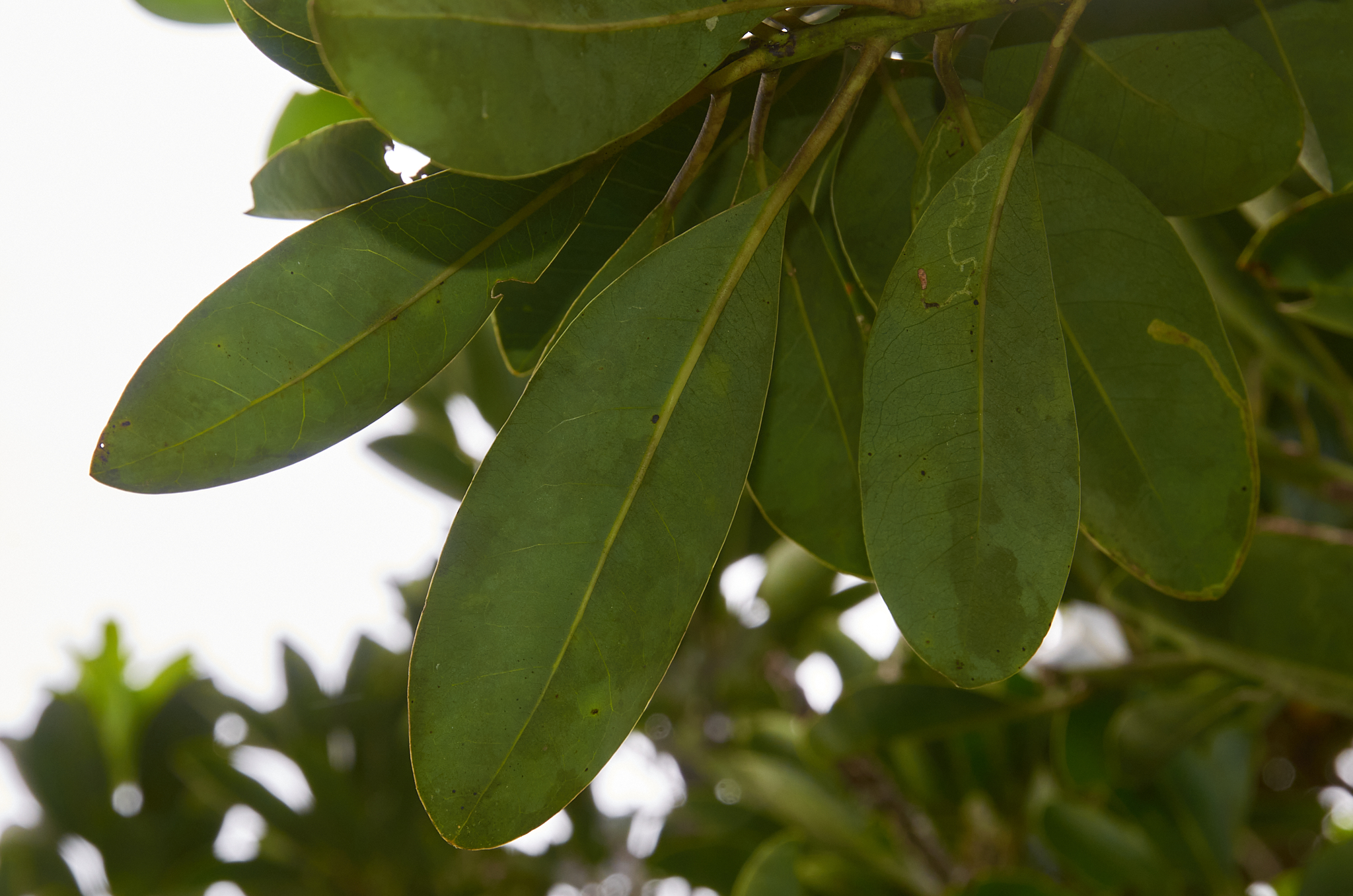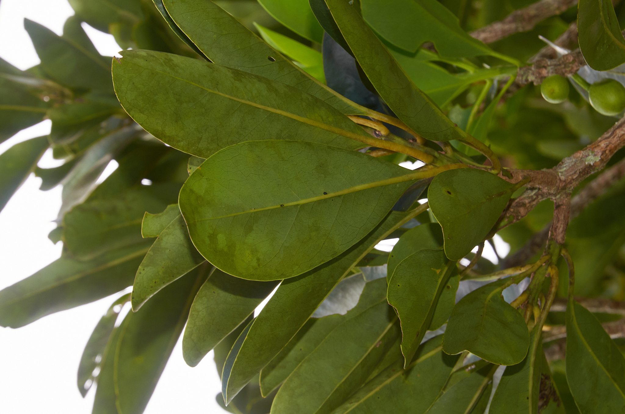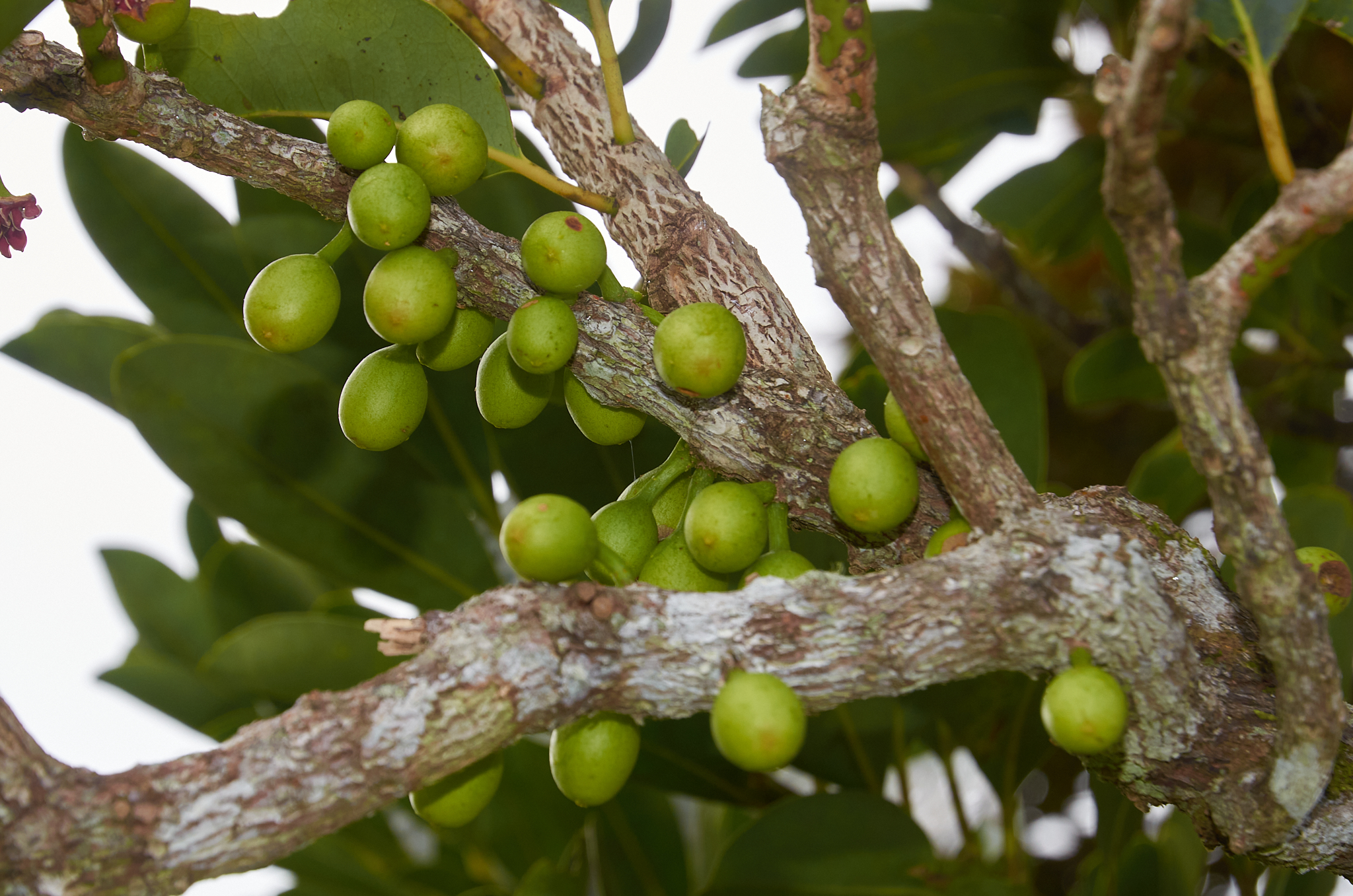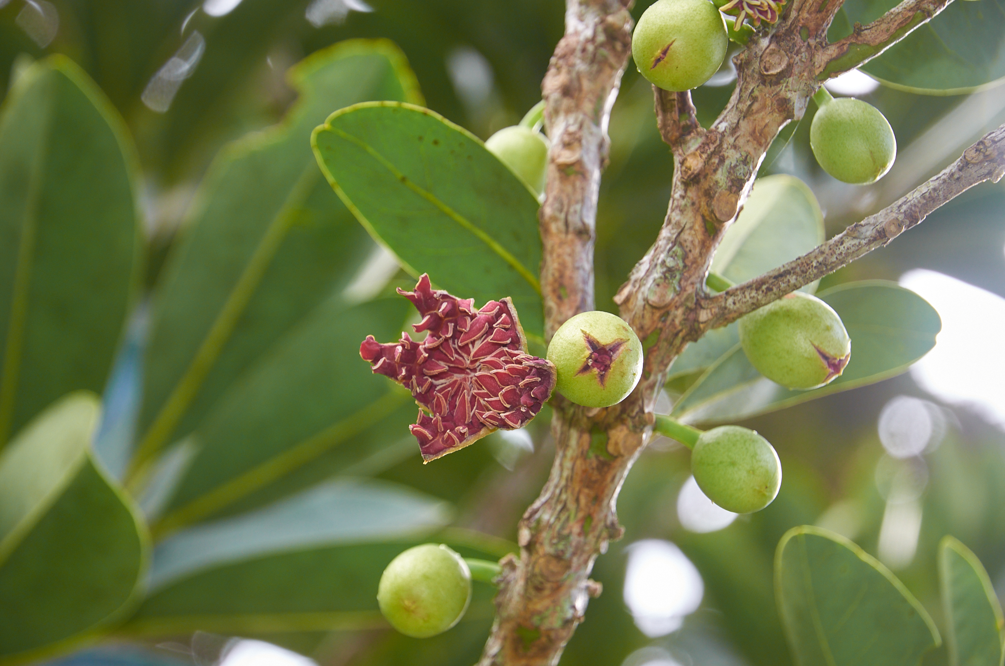 Commentaires : Arbre (jusqu’à 15 m de hauteur) à feuilles entières, opposées ou presque, pétiolées, à limbe assez épais. La plante est cauliflore ; les fleurs sont insérées sur les axes. Les boutons sont ovoïdes et lisse. La paroi des feurs mâles se fend jusqu’à la base en 4 ou 5 lobes, exposant les étamines rouge à pourpre. La paroi des fleurs femelles se fend peu et devient précocement liégeuse.