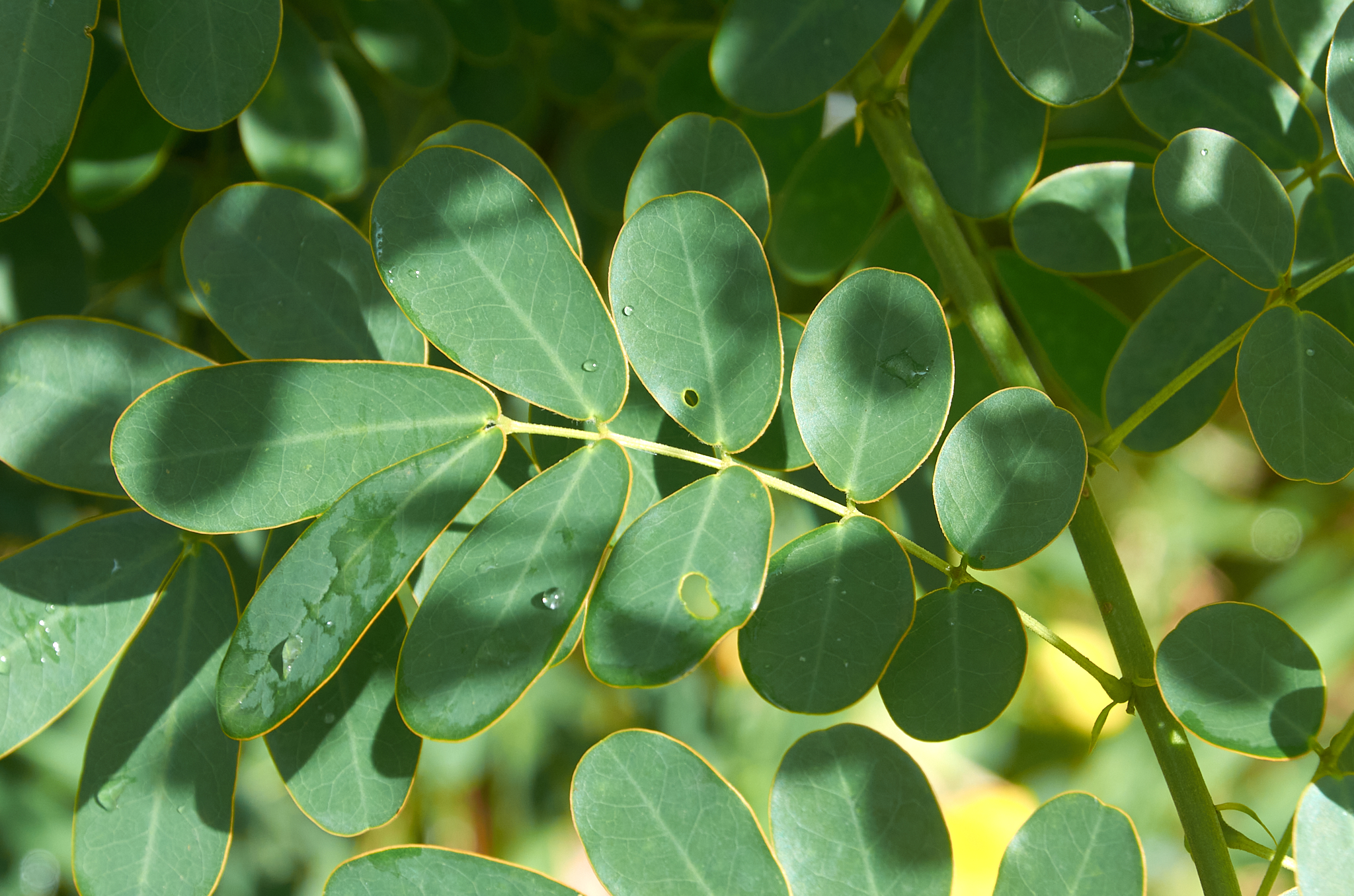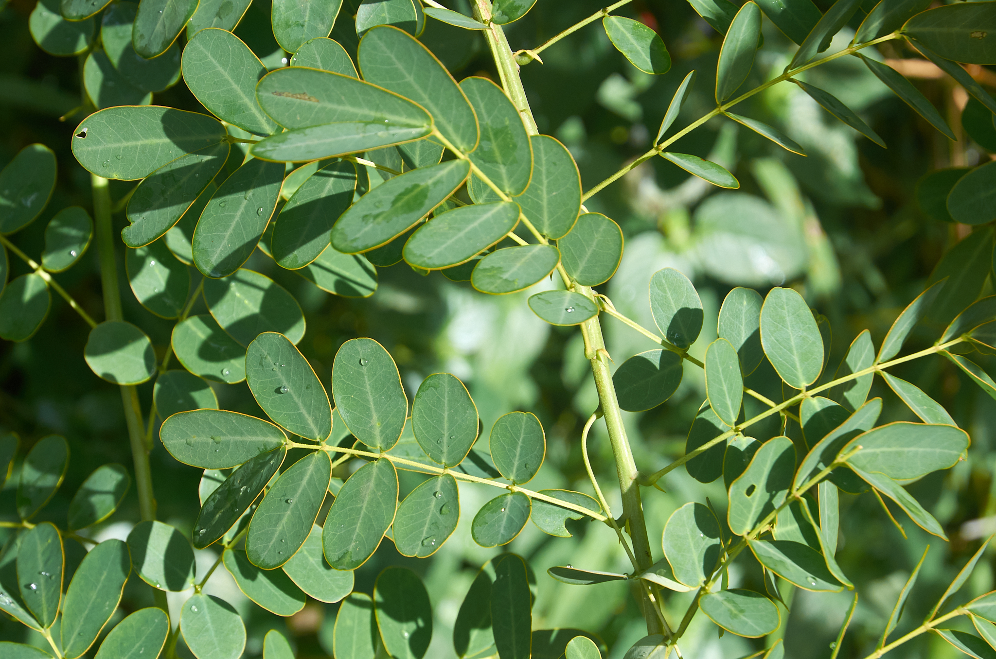 Les feuilles sont composées de 4 à 5 paires de folioles, avec une glande entre la paire de folioles basales.