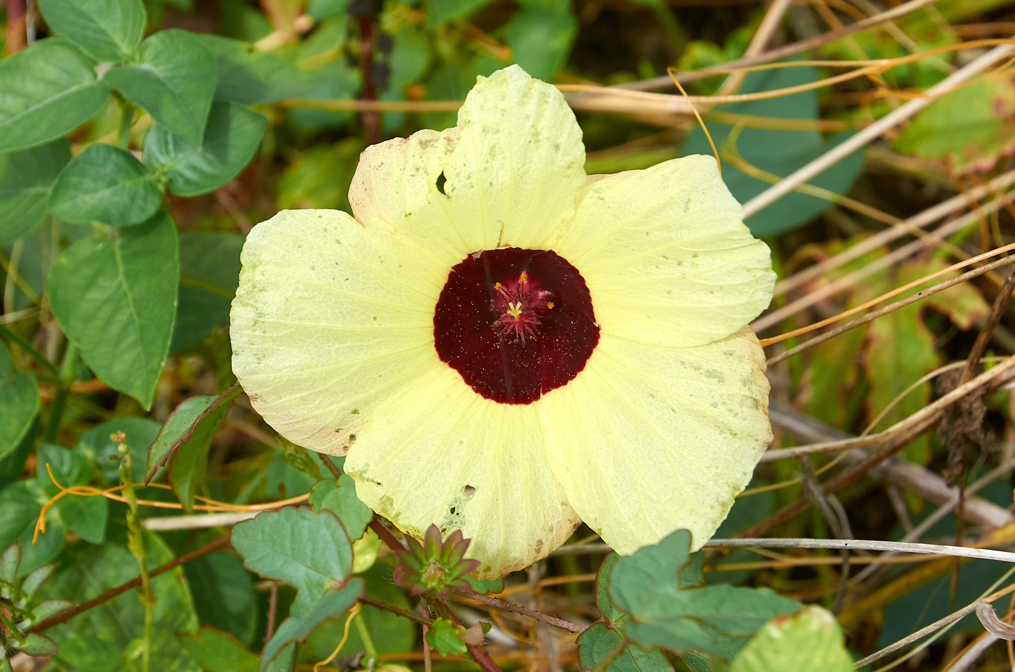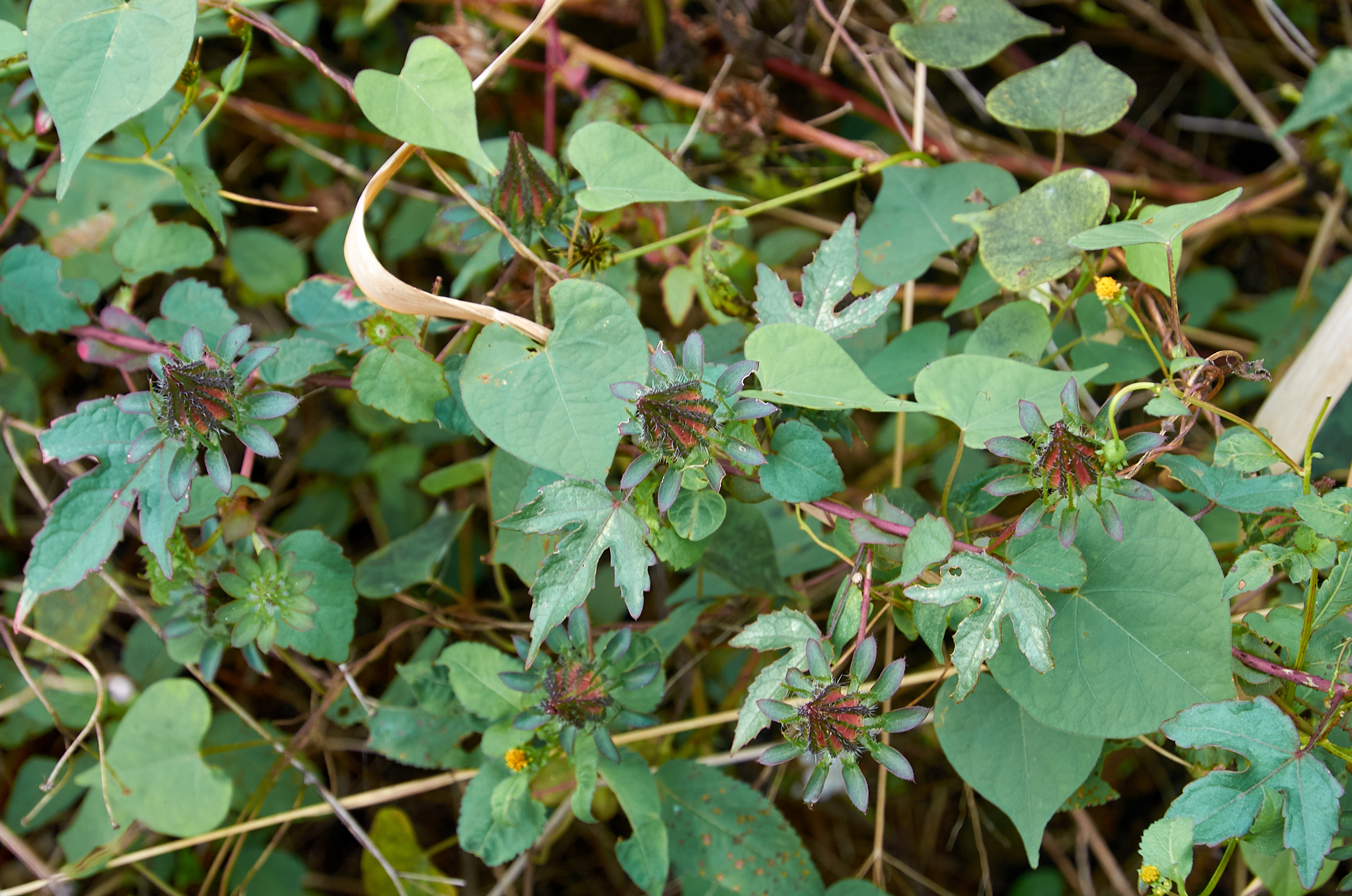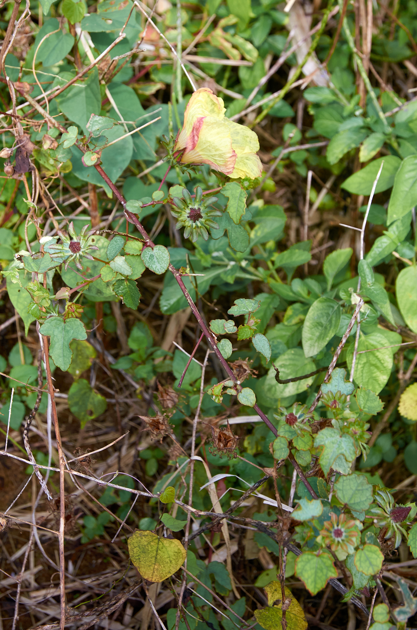Les feuilles sont lobées (3 à 5 lobes) mais entières vers la base des tiges. Les fleurs, largement étalées, de 8 cm de diamètre environ, sont jaune à coeur pourpre sombre. Elles sont suivies de fruits secs, des capsules entourées du calice persistant.