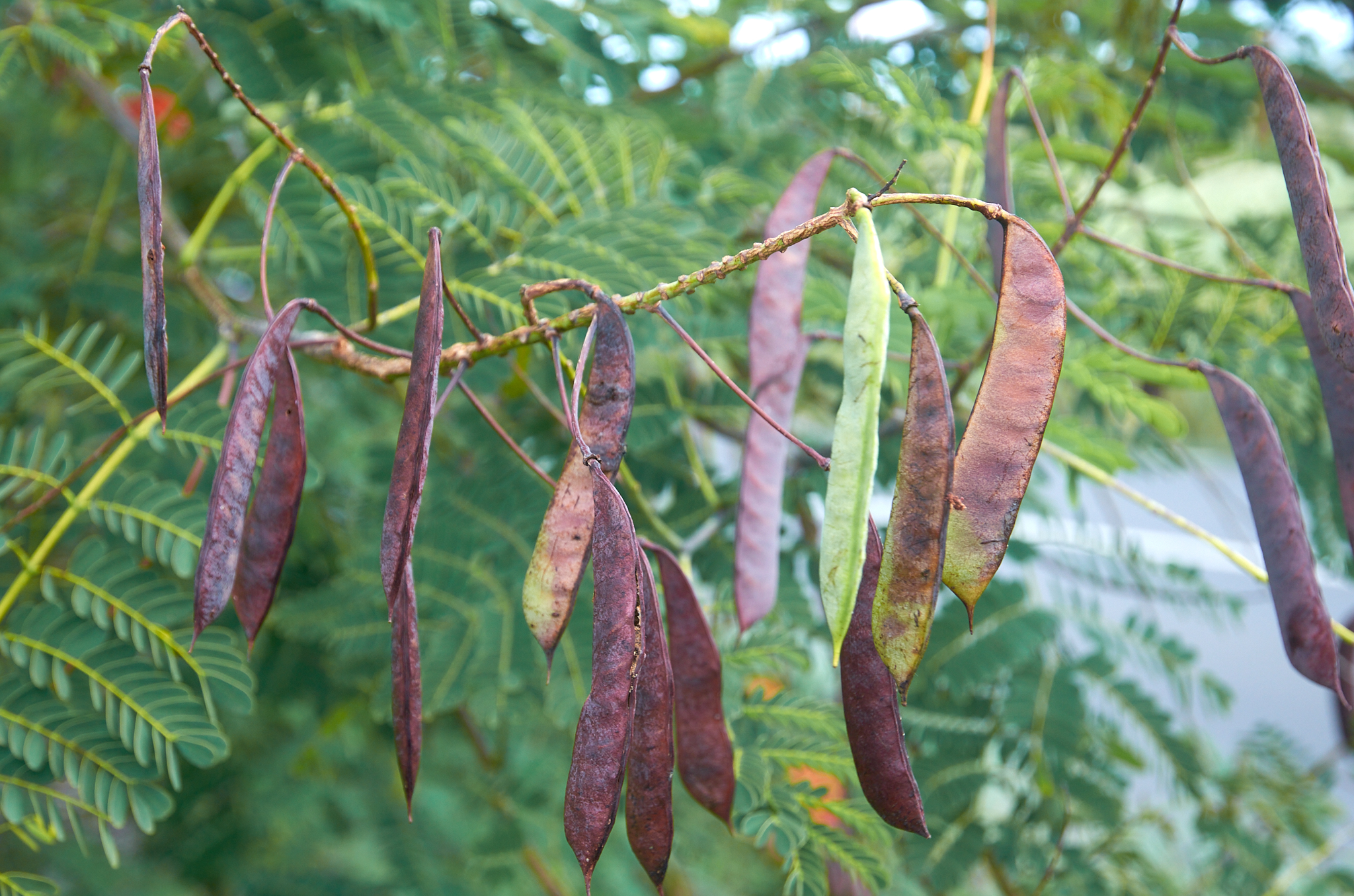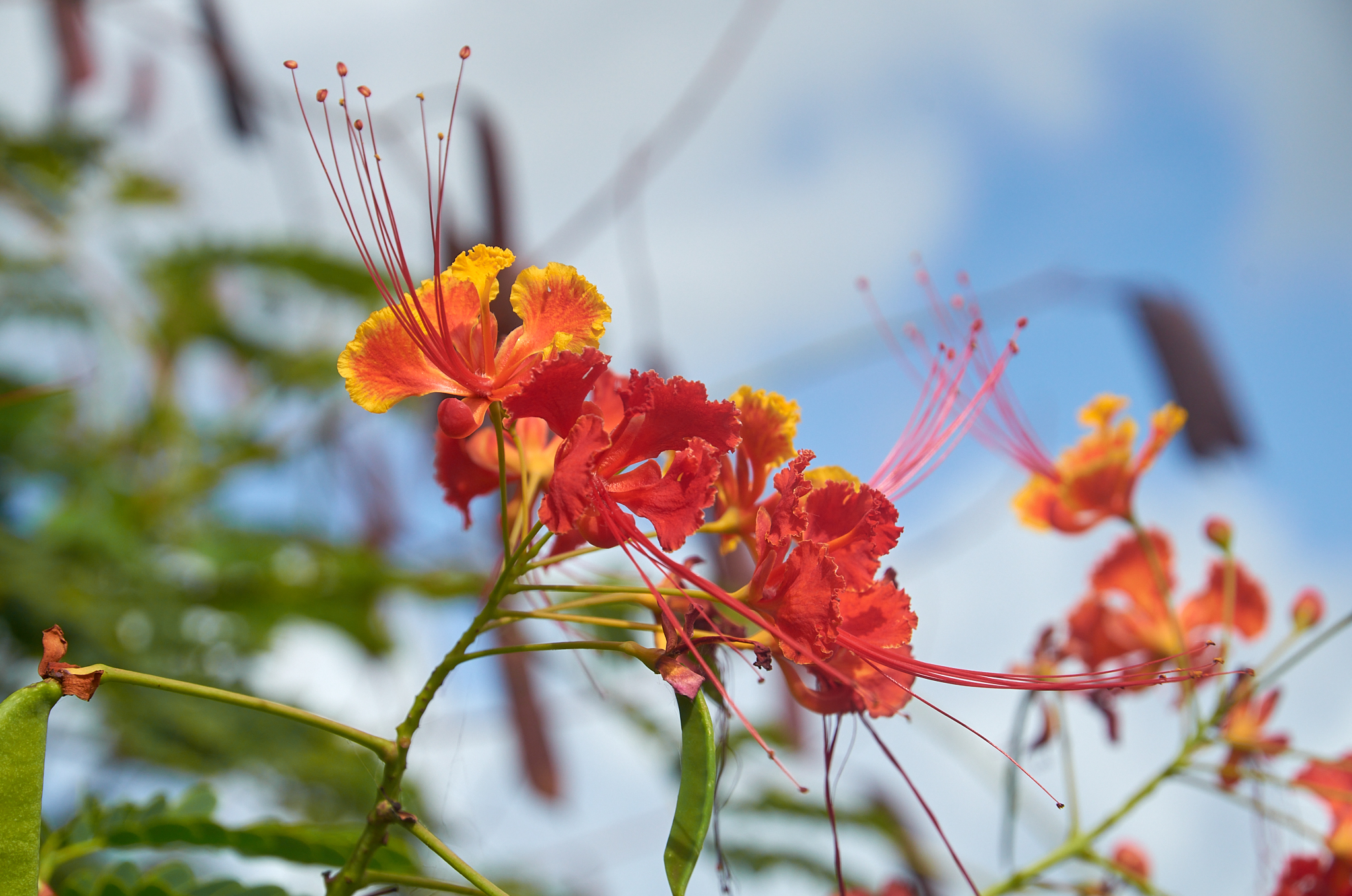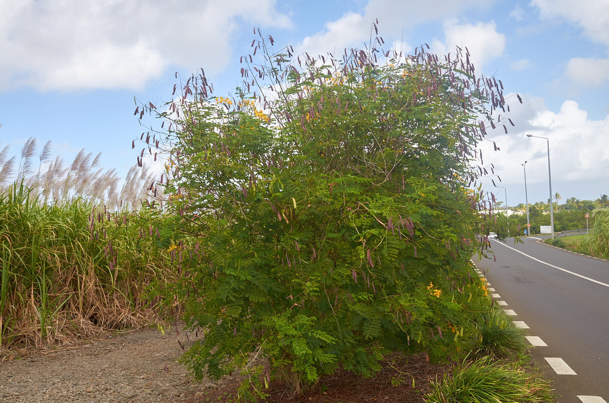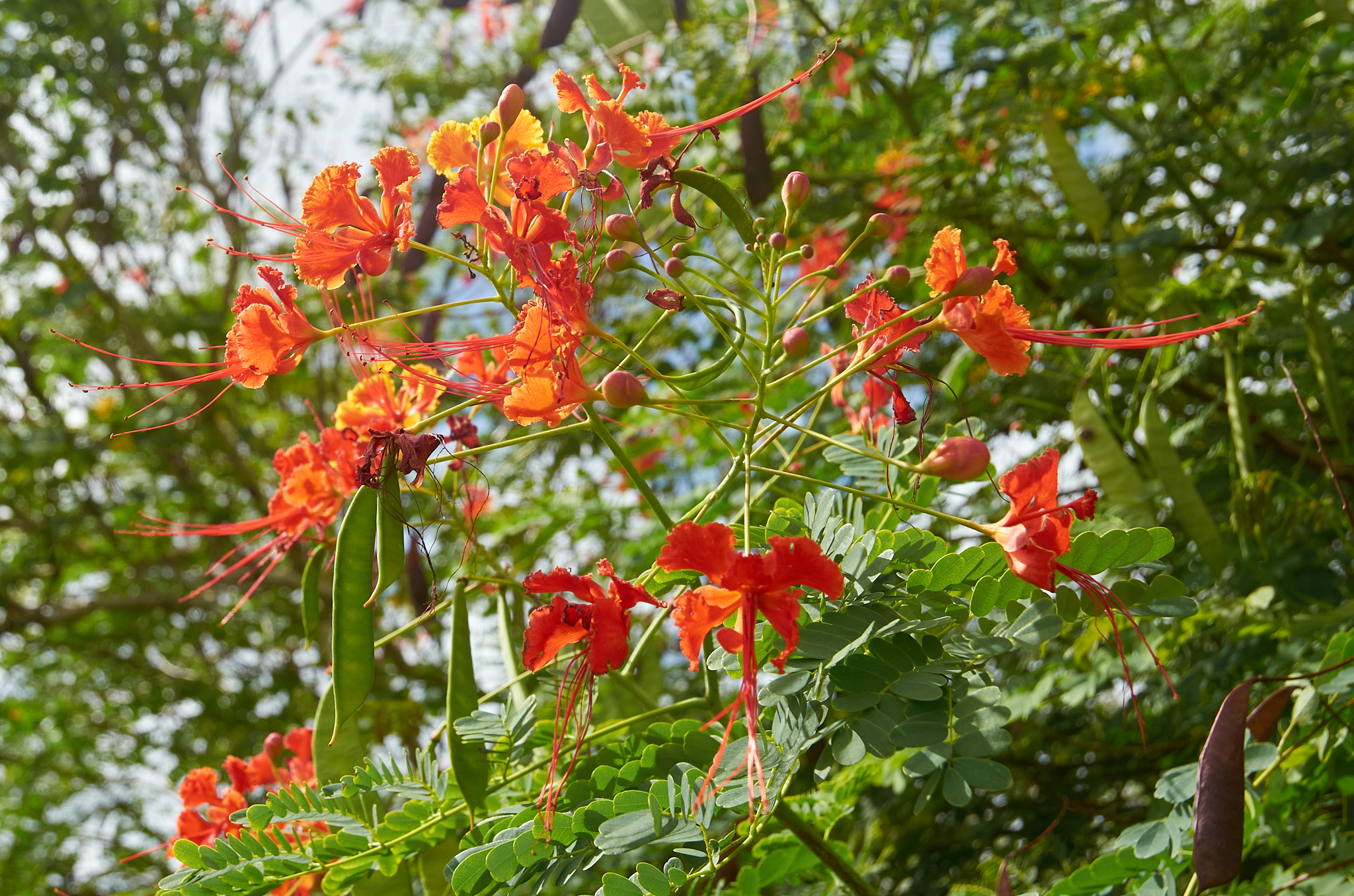 Commentaires : Arbrisseau ou petit arbre (1 à 6 m) largement cultivé sous les tropiques pour les qualités ornementales de ses fleurs aux couleurs vives, allant du jaune au rouge. Les fruits sont des gousses pendantes. Les feuilles sont doublement composées, comportant 3 à 10 paires de pennes composées chacune de 5 à 13 folioles.